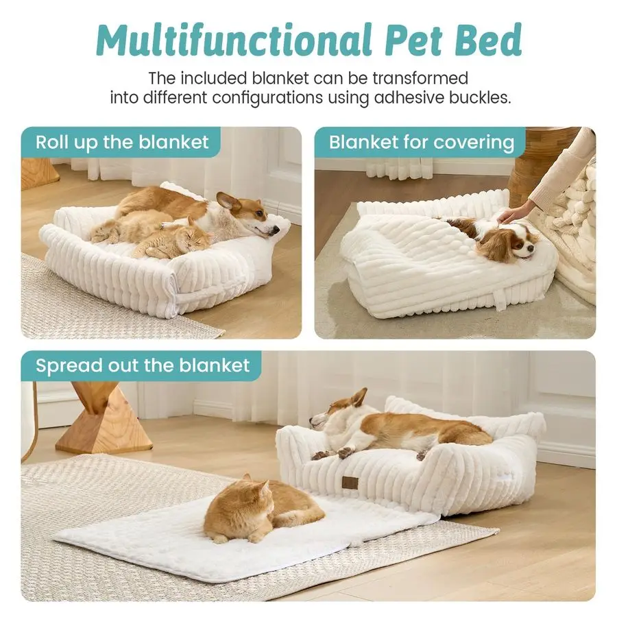 Cat Bed with Removable Cover, Multifunctional Plush Faux Fur Pet Couch Bed with Blanket, UltraSoft Pet Furniture for Cats amp Sm
