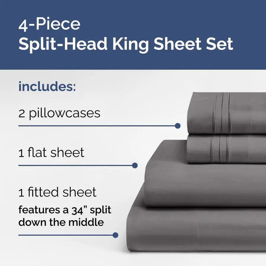 4 PIECE SPLIT KING HEAD SHEETS SET Elevate your bedroom with our flex top King sheets designed with a sleek, modern look. The split head king sheet set includes 2 pillowcases 20 x 30, a Flat sheet 102 x 108 and a Fitted sheet 78 x 80 which features a 34 split down the top middle.