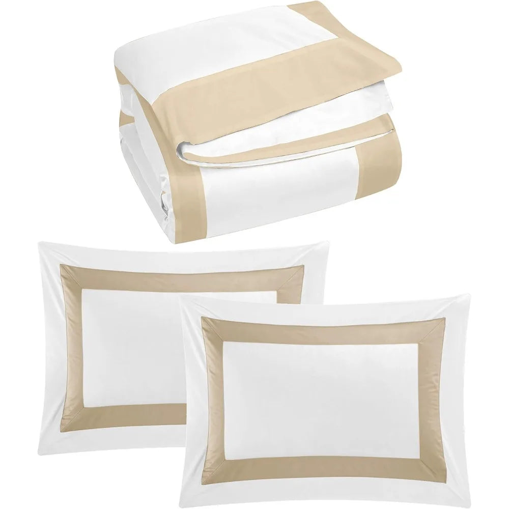 - You get a queen-set that includes a 92" x 92" duvet cover with a 5" beige border and two 20" x 28" shams with a 3" beige border and a white inner frame.
