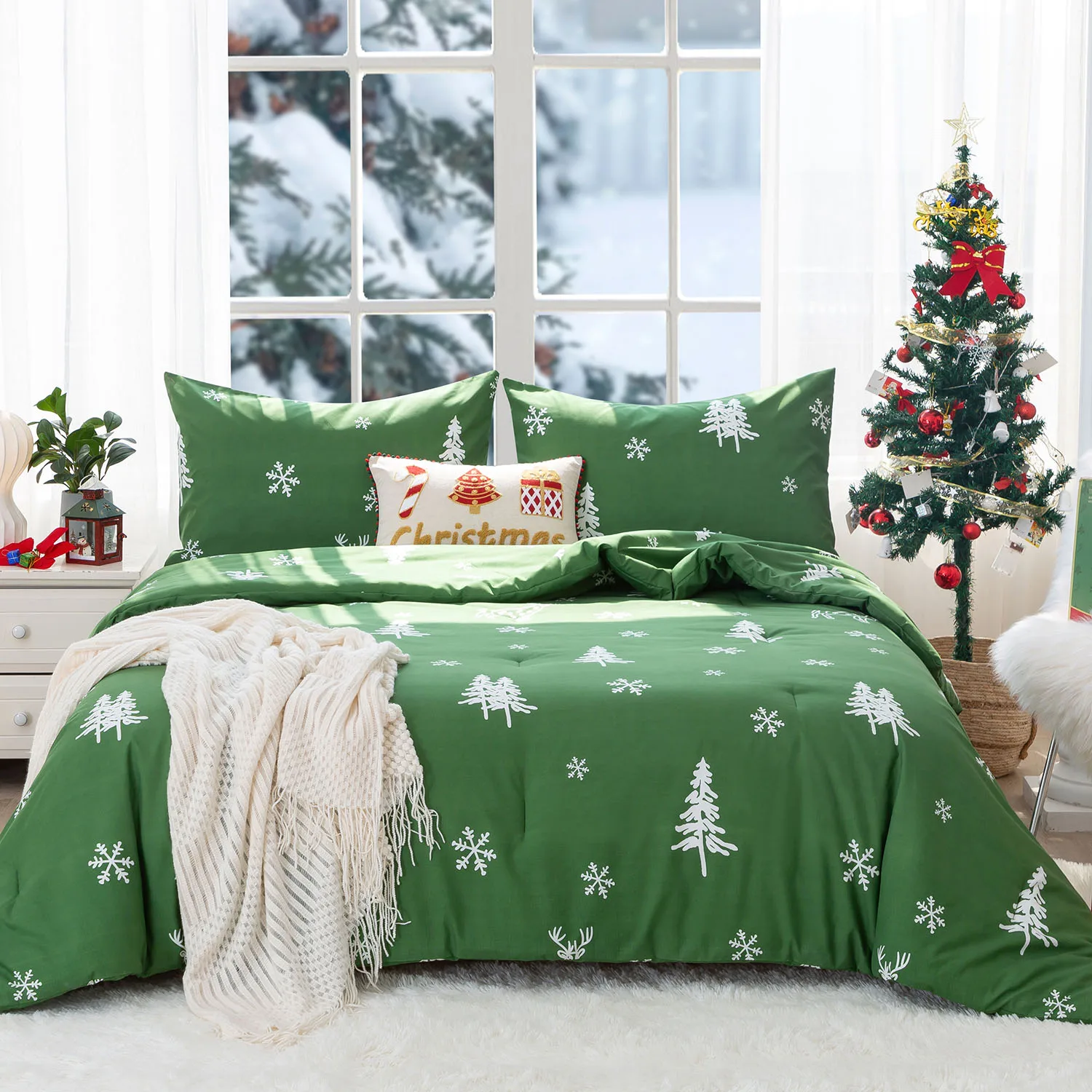 Soft PolyCotton Bed Comforter Queen Size, Christmas Reindeer Elks Bedding Down Alternative Comforter Set with Pillow Sham