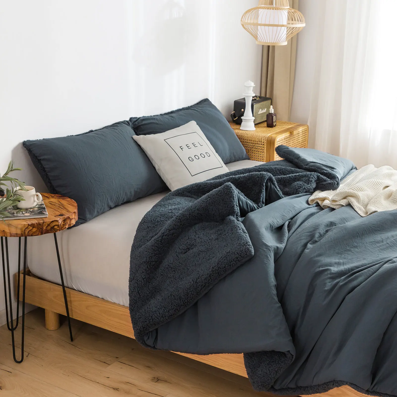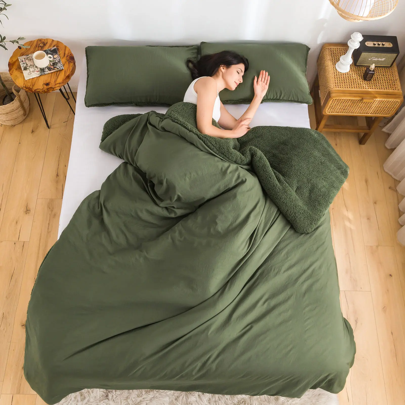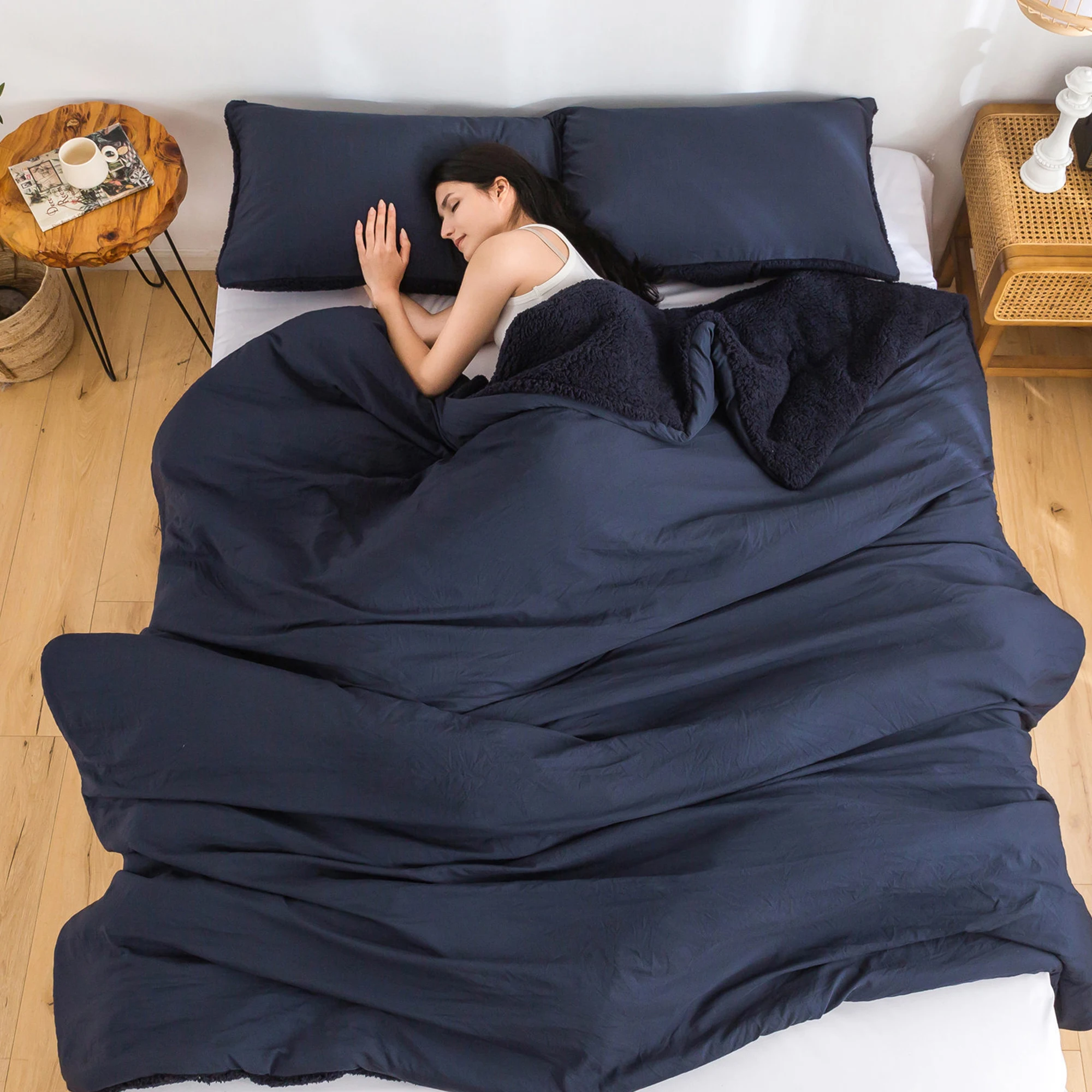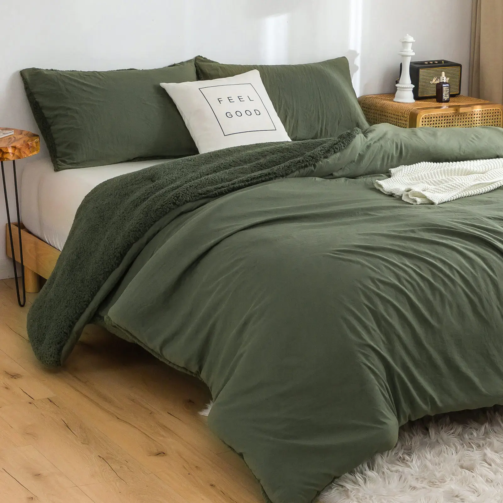 REVERSIBLE COMFORTER DESIGN - Outside is Cozy Fluffy Fleece Sherpa,Middle is 320GSM PP Fabric,Inside is Sklin Friendly Soft Washed PolyCotton Microfiber.You can use it with the Sherpa side in Cold winter,use the Washed PolyCotton side in fall and spring.
